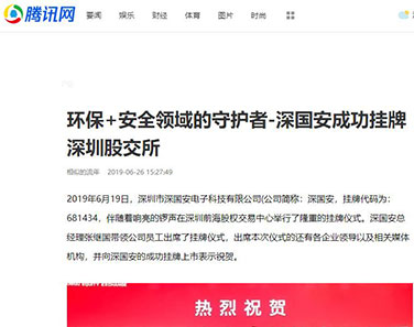 2019年6月19日,深圳市深國安電子科技有限公司作為廣東省氣體檢測儀行業強勢登入股交所,掛牌前海股交碼為:681434,樹立了行業標桿。人民日報社、鳳凰網、中華網、中國財經時報網、騰訊網、新浪網、搜狐網、未來網財經、中國安防行業網、慧聰網、北國網、中國應急網、太平洋安防網等眾多媒體進行了報道。
